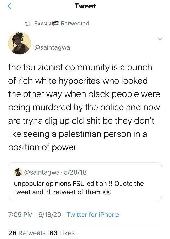 On June 5th, 2020,  the Student Senate removed its previous president, Jack Denton, who was accused of making derogatory comments. They selected Ahmad Daraldik, a member of the FSU SJP, to take his place. Because of our history of experiencing bullying at the hands of SJP and their anti-normalization policy, I was concerned but open to giving President Daraldik a chance to lead without bias. Unfortunately,  in the ensuing days, more and more evidence came to light about Daraldik’s antisemitic views and inability to lead impartially.
