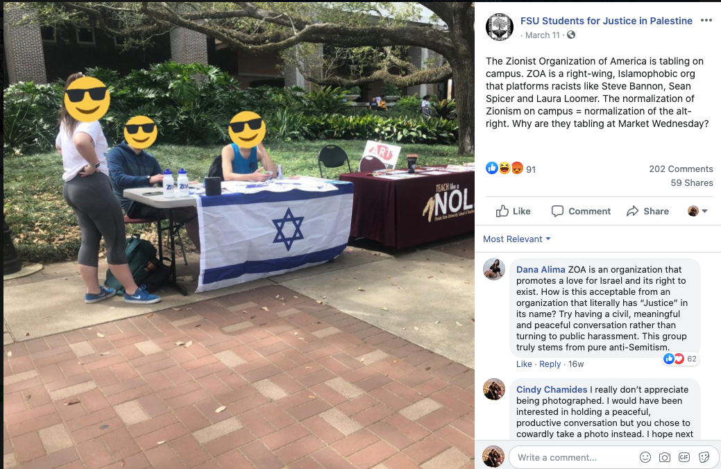 At FSU, Noles for Israel is met by the opposition of Students for Justice in Palestine (SJP) which promotes the destruction of Israel using hateful tactics and bullying. We have never had any personal interactions, as they tend to avoid confrontations on campus. While we would like to have dialogue with them and have even attempted to in the past, SJP has an anti-normalization policy at the national level. An example of the type of opposition Noles for Israel faces from SJP happened this past March. At a “Market Wednesday” in the beginning of March, my group had our table set up as usual. Without our knowledge, a member of SJP took a picture of us and our table and posted it to their official Facebook account. They went as far as calling us “Islamophobic” and questioned the school for allowing us the right to promote Noles for Israel on campus. Although I reached out and let them know that all we are looking for is a meaningful conversation, they continue to respond with baseless hatred. Instead of having a respectful debate, they decide to personally target us through social media. Their attacks were not only untrue but also demonstrate the attempt to cause damage to us reputationally on campus or in our careers.
